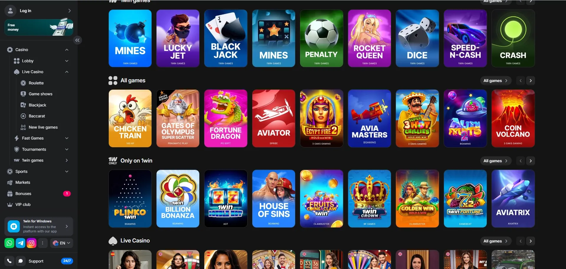 Detectamos un espacio “1win Originals” con foco en instant/crash: