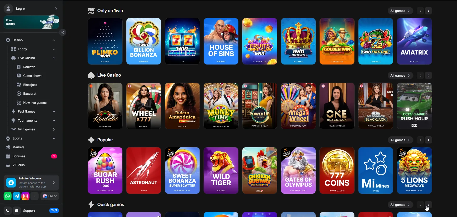 | Originals/Exclusivos | 1win Originals (Lucky Jet, Speed‑N‑Cash) | Colocados de forma prominente; se cargan vía HTML5. |